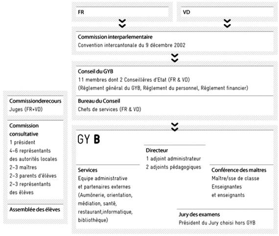 La convention et les règlements définissent les autorités du GYB. Pour tenir compte de son caractère intercantonal, l'établissement est doté de la personnalité juridique et il possède ses propres organes supérieurs de décision et de supervision.
