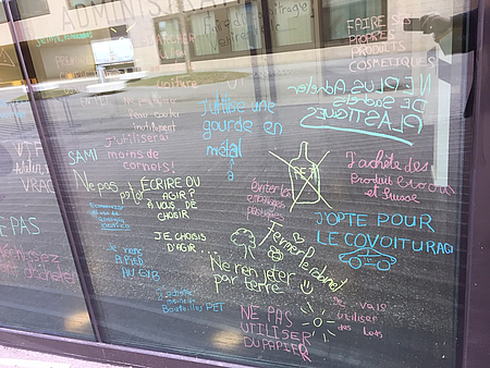 Les comportements au sein de l’école suivent ce même souci d’efficacité énergétique et de respect de l’environnement. En janvier, les vitres de l’école ont fait office de panneau d’affichage pour toutes les bonnes idées.