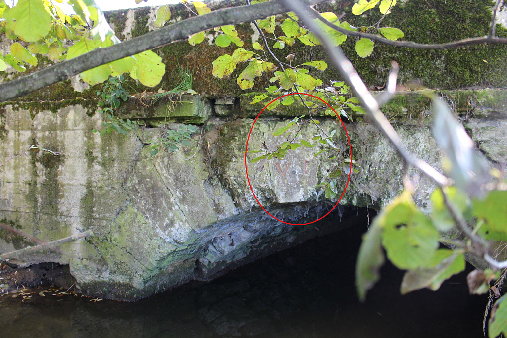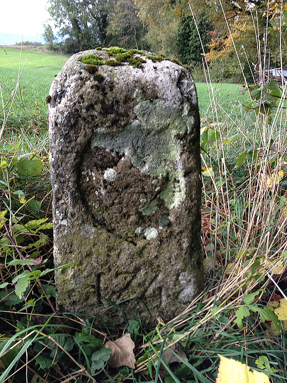Ci-contre, une borne bien singulière… ! Située sur un pont enjambant la Petite Glâne (au lieu-dit Vers le Moulin, lieu-dit qui a retrouvé cette appellation en 2005 alors qu’il la portait depuis les plus vieilles cartes topographiques jusqu’en 1954), il faut soit se pencher sur le parapet, au risque de prendre un bain involontaire, soit s’approcher de la berge pour l’observer depuis cet endroit.