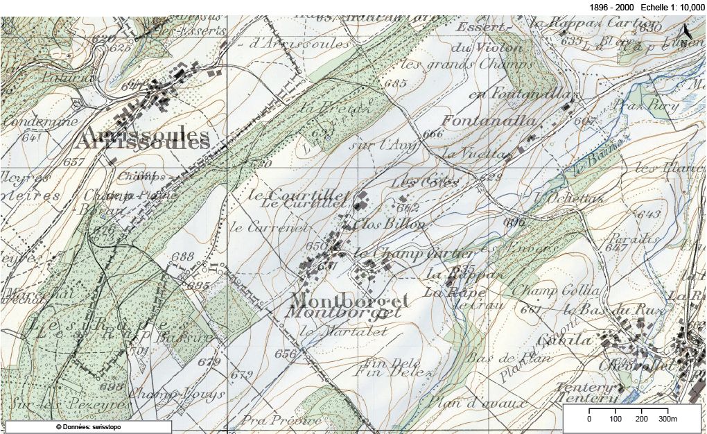 Le site de Swisstopo permet un travail important de recherche des frontières et de leurs modifications au fil du temps. Par exemple la carte superposée ci-contre, reflétant la situation de la région d’Arrissoules – Montborget en 1896 et 2000.