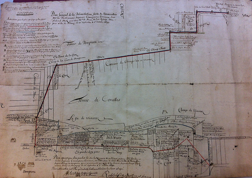 Ainsi, pour remonter plus en arrière, il faut passer par les archives cantonales. Souvent, il existe un procès-verbal faisant état des conventions de délimitations de territoire. Il est généralement accompagné de cartes sommaires, reportant approximativement les parcelles concernées et leurs propriétaires. Ces documents nous permettent alors de mettre à jour l’existence de bornes très anciennes sans pour autant connaître leur position de manière précise ! On peut consulter un exemple ci-contre: « Plan général de la Delimitation faites & Renouvellée par les Très honorés Seigneurs Commissaires Généraux Jean-Friderich Steck pour leurs Exces de Berne, & Jean-Rodolph Fiva, pour L Ex de Fribourg, Le 25 septembre & 5 d’octobre 1693 » (cliquer pour agrandir).