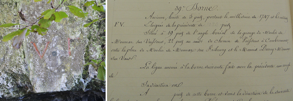 Un « Projet de verbal de limite entre les cantons de Vaud et de Fribourg » établi par M. Golay en 1851 a permis à une étudiante du GYB de retrouver 35 des 78 bornes initialement placées pour délimiter le territoire fribourgeois dans le Pays de Vaud, mais bernois à ce moment-là de notre histoire.