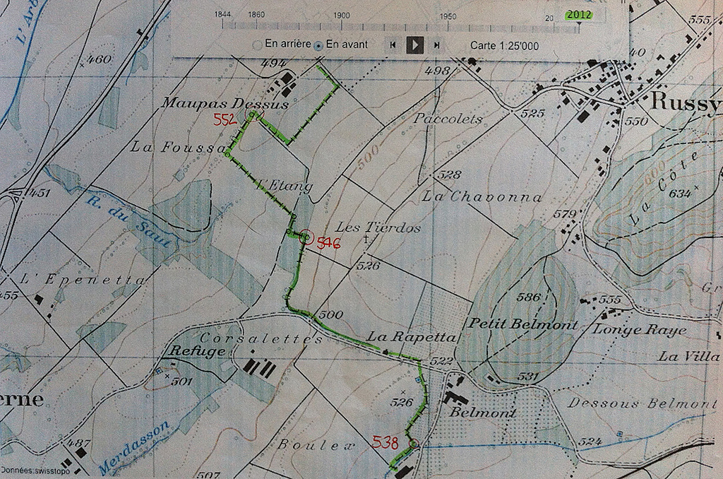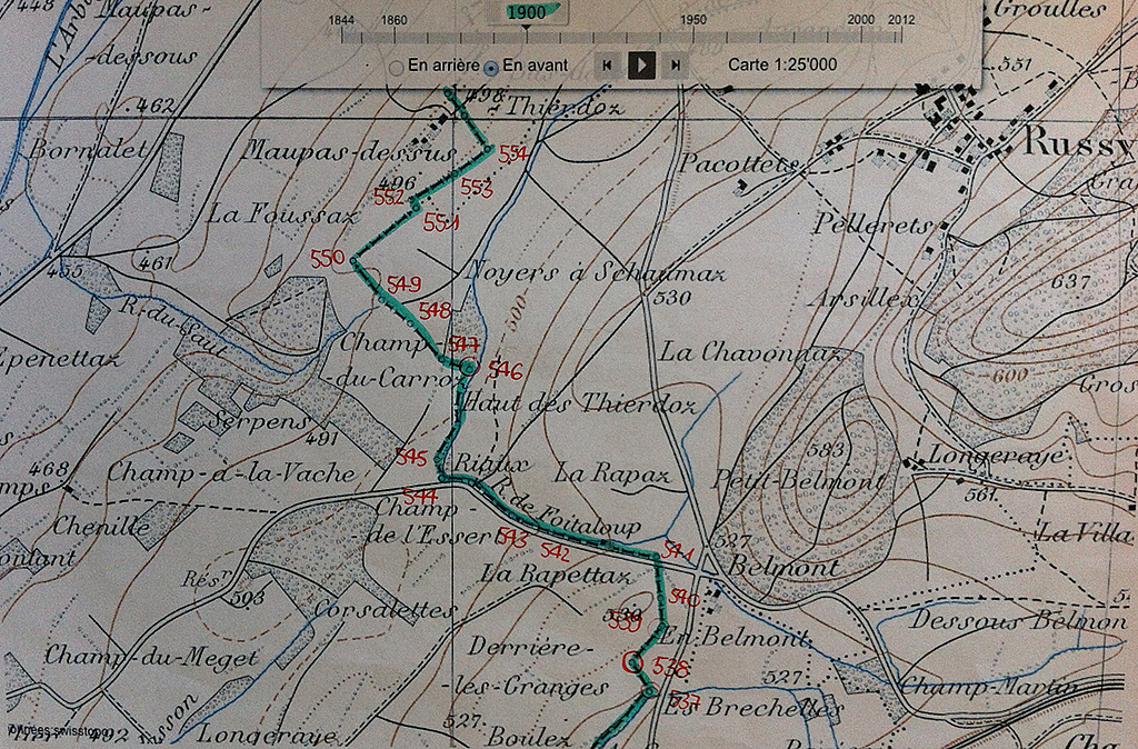 La carte de 1900 et celle de 2012 sur lesquelles on peut constater le déplacement de la frontière mais surtout l’emplacement de la borne 546 (source des cartes ci-contre : Office fédéral de la topographie).