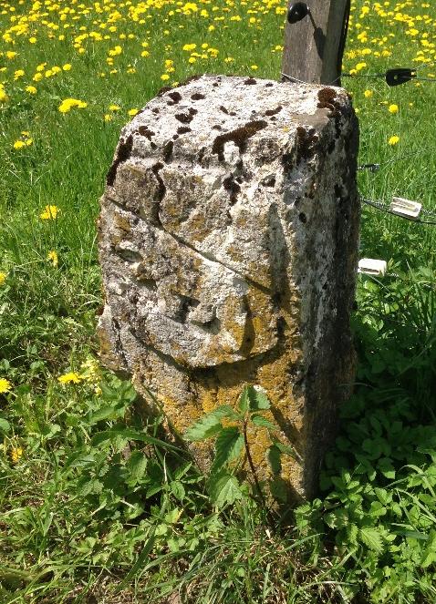 Ci-contre, la borne no 78 située aux points de coordonnées 46o 43’ 26.501’’ N / 6o 45’35.122’’ E entre les communes de Vuissens et Montanaire. On y distingue un blason qui doit être celui de Fribourg vu l’orientation de la borne. C’est la dernière des bornes marquant le territoire de Vuissens.